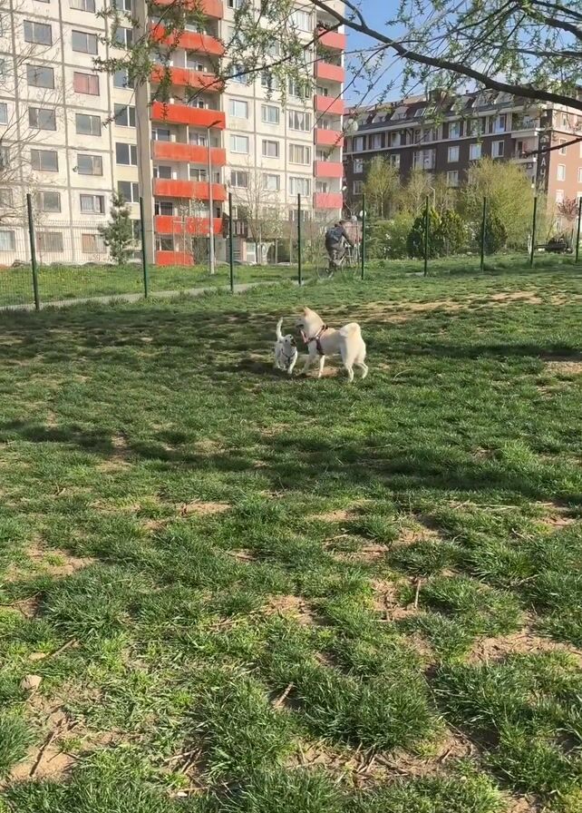 - "The scene depicts a grassy fenced-in area with two dogs playing, a white Jack Russell Terrier and a white Shiba Inu" by FM-6irF43, licensed under CC BY 4.0