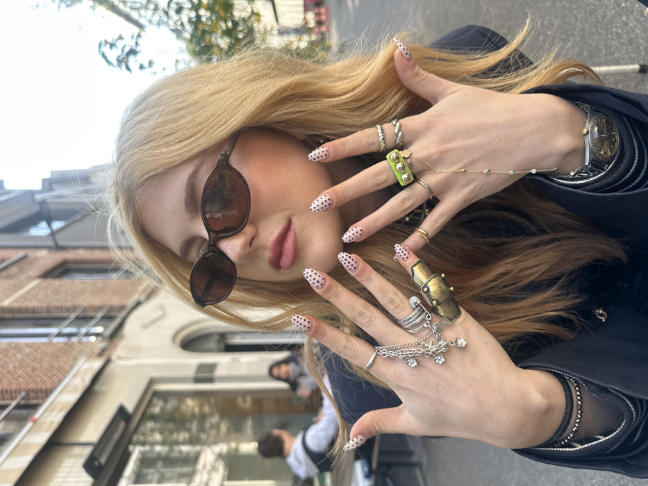The image displays a waist-up portrait of a young individual with long, wavy blonde hair, wearing dark, oval sunglasses, and a dark, long-sleeved garment. The subject's lips are a pink/nude color with a slight pout, and cheeks show a rosy blush. Both hands are raised and spread, prominently displaying long, almond-shaped fingernails, each painted with a light base coat and small black polka dots. On the left hand (viewer's left), the index finger has a silver ring with dangling chain charms connected to a stack of silver rings on the middle finger, one featuring a clear gemstone. The ring finger displays a large, ornate brass-colored articulated ring. A small gold-colored band is on the pinky finger. The left wrist is adorned with multiple dark beaded bracelets and a silver-colored chain bracelet. On the right hand (viewer's right), the index finger has a small gold-colored band. The middle finger features a bright green rectangular ring with three gold studs, from which a delicate gold chain with small clear stones descends towards the wrist. A thick silver-colored twisted band ring is on the ring finger, and a small gold-colored band on the pinky finger. A large, round, dark-faced wristwatch with a metal band is visible on the right wrist. The scene is set outdoors on a street in Antwerp, Belgium. The background features a multi-story brick building with arched ground-floor windows, indicative of European architecture. A metal heater is affixed to the building's facade above a window, suggesting an outdoor seating area. Two blurred figures are visible in the left background, appearing to be seated at a table. Blurred green foliage is present on the right side of the background. The ground is light grey pavement. The lighting is bright and natural, consistent with daytime.