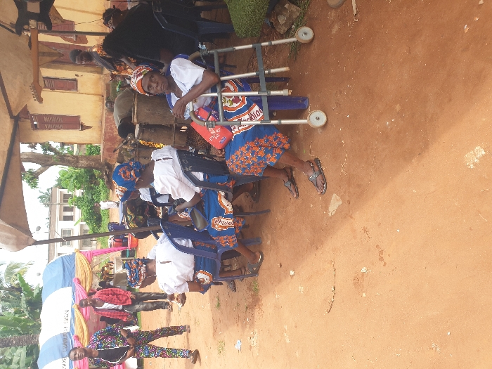 An outdoor gathering is depicted on reddish-brown dirt ground in Nkpor, Nigeria. In the immediate foreground, an elderly woman sits in a blue plastic chair, positioned behind a silver medical walker with two front wheels. She wears a white top, a blue and orange patterned headwrap, and a matching wrapper; she holds a red bag and a plastic water bottle. To her left, three other women are seated in similar blue plastic chairs, facing away or sideways, also in white tops, patterned headwraps, and wrappers. Behind these seated women are multiple large, traditional drums or percussion instruments. To the left of the frame, two men stand. The closest man wears a multi-colored patterned suit (shirt and trousers) and sandals. The man behind him wears a red long-sleeved shirt and dark trousers. In the background on the left, a large tent with blue and white stripes and pink and gold fabric draping is visible, sheltering tables with items. Further in the background on the right, a single-story building with a yellowish facade and brown wooden shutters is present. Above this area, suspended from an overhead structure, is an electric guitar neck and other elements of a sound system, under a light-colored canopy. Other individuals are partially visible standing around the building and sound equipment. Beyond these structures, a multi-story white building with windows is discernible, partially obscured by dense green vegetation and trees under an overcast sky.