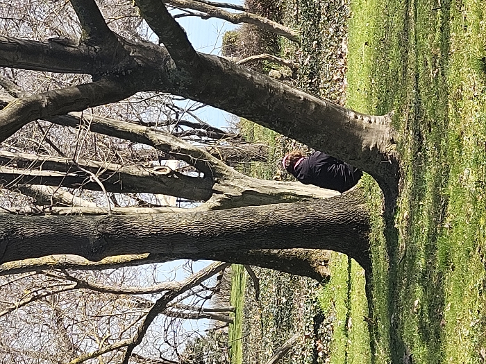 The image depicts an outdoor park scene, likely in late autumn or winter due to the bare deciduous trees, under clear daylight conditions