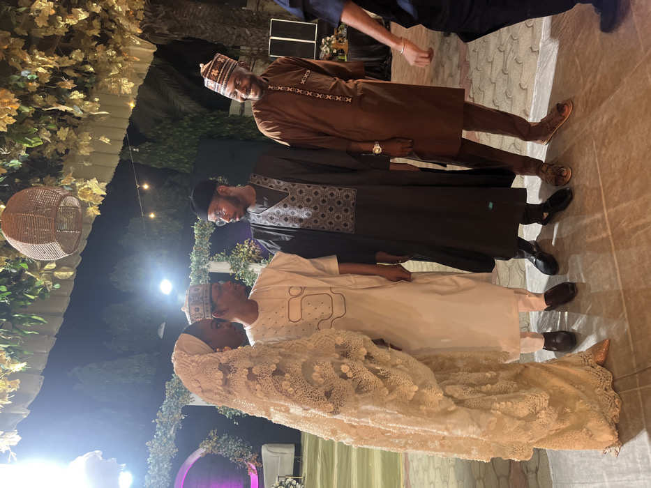 A group of four individuals, likely at a wedding or celebratory event, stand in a line. The person at the front is wearing a white, embroidered dress and veil. Behind, two men are dressed in traditional attire, one in white and one in dark brown robes. The fourth individual wears a brown robe. The setting is outdoors, with light-colored flooring and decorations including lights and foliage. A basket-like object hangs near the top-left corner.