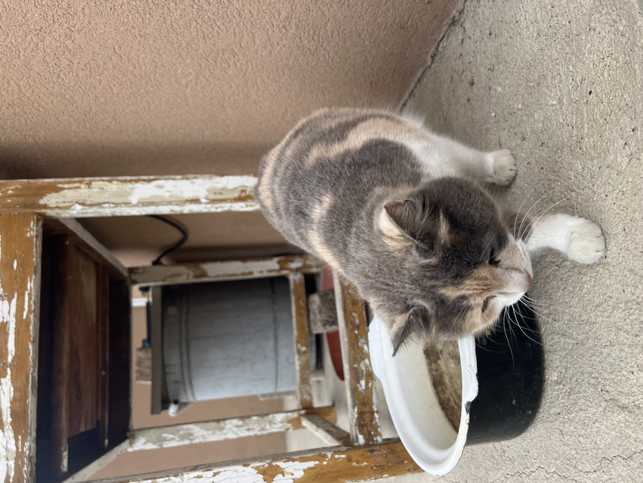 A calico cat, exhibiting a mottled grey, white, and tan coat pattern, walks on a light grey concrete surface. Its head is lowered and angled slightly towards the left. Immediately to its left, a black enameled bowl with a chipped white rim contains a light brown granular substance, likely dry food. In the background, a weathered wooden stand, with extensive peeling white paint exposing the wood beneath, occupies the left side of the frame. Behind this stand, a grey metal bucket or container is visible, along with a dark cable running against a textured, light brown or peach-colored wall. The scene is located in the city of Varna, Bulgaria.