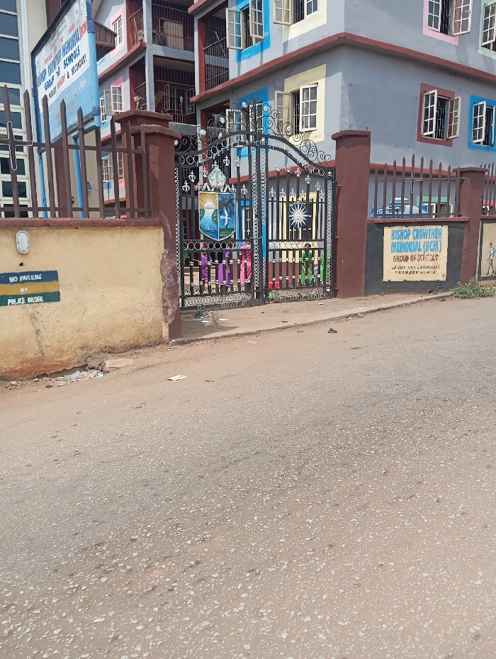 The image depicts the street-level entrance to the Bishop Crowther Memorial Schools in Onitsha, Nigeria
