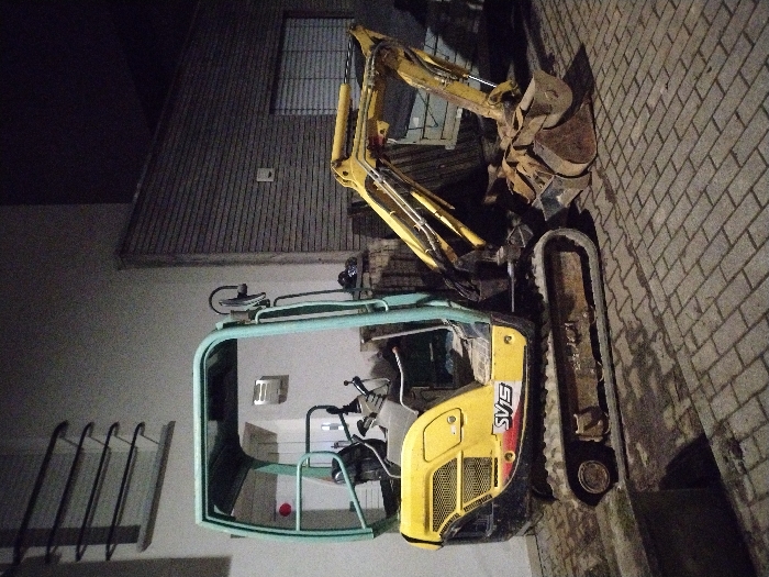 A yellow excavator rests on a brick surface, oriented vertically. It features a cab with a light-green frame and an enclosed seat. The excavator arm is positioned upward, ending in a bucket. A continuous track is adjacent to the excavator. The backdrop includes a building with metal siding and a window. A metal bike rack is also present.