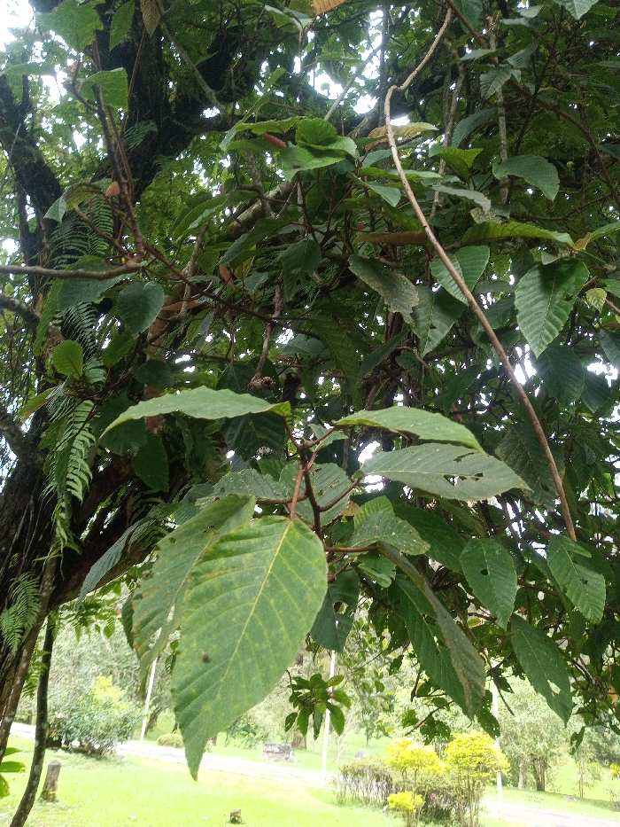Lush green foliage dominates the scene, featuring textured leaves of varying sizes and shapes. A thick tree trunk, partially covered in ferns, rises to the left. Sunlight filters through the dense canopy, illuminating the leaves and creating highlights. A neatly maintained lawn with bushes and trees forms the background, with a hint of a road in the distance. The image captures a vibrant outdoor setting.