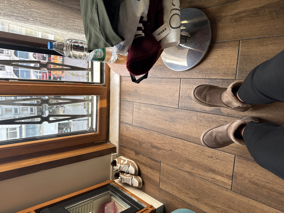A top-down shot shows a corner of a room. A window reveals a street view. On the ledge sits a water bottle. A small round table holds a shopping bag with clothes. Two pairs of shoes are present: one near the window and the other on a person. The person wears black leggings and brown UGG-like boots, standing on a wood-paneled floor. The room's decor includes a glass-topped display case and what appears to be a small stool or ottoman.