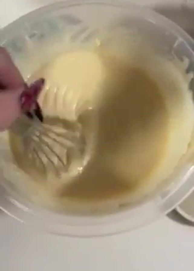A close-up shot shows a person's hand, adorned with multiple rings and long, pointed, dark red fingernails, using a whisk to mix a light yellow, creamy substance in a clear plastic bowl. The background is a light-colored countertop or surface. The whisk moves rapidly, creating swirling patterns in the mixture.