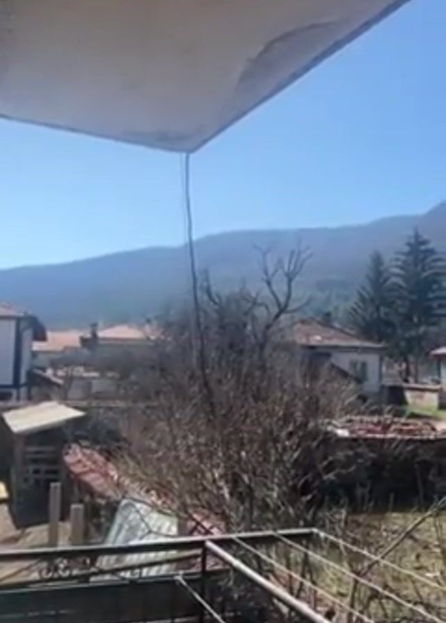 The video is a stationary shot from under an overhang of a building, possibly a balcony, overlooking a rural landscape on a sunny day