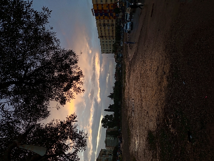 An urban landscape scene captures a vibrant sunset sky through tree branches. Buildings line the horizon, with cars and figures present on the side. The foreground consists of a muddy ground. The image is rotated counterclockwise, making the sky appear on the side.