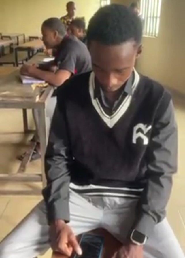 classroom with several students seated at desks. The main focus is on a student in the foreground, wearing a black and white V-neck sweater over a gray shirt and gray pants. He is sitting on a desk, looking at and touching a smartphone in his hands. In the background, other students are at their desks, most appearing to be studying or writing. A person, likely a teacher, is standing towards the back of the room. The classroom has basic features, including desks arranged in rows, barred windows, and light-colored walls.