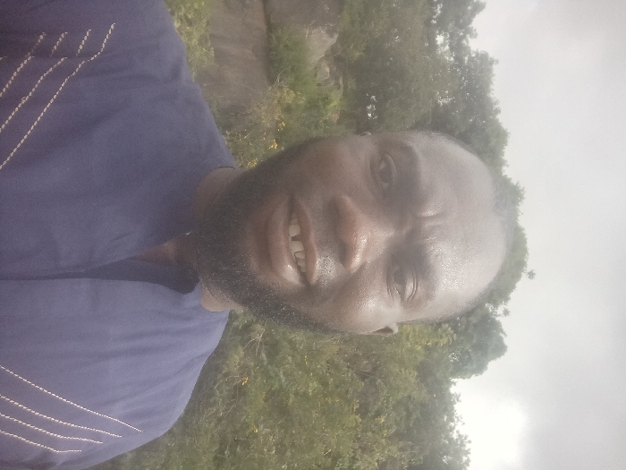 The image displays a male individual, appearing to be in his 30s or 40s, with a dark complexion, closely cropped dark hair, and a dark beard. He is presented in a close-up portrait from the chest upwards, facing the camera directly with a subtle smile that reveals a visible gap between his two upper front teeth. His skin exhibits a slight sheen. He is dressed in a dark blue, collared garment, possibly a traditional shirt, adorned with light-colored, linear embroidery detailing on the left chest and shoulder area. The background features dense green foliage, including trees and bushes, with large, grey rock formations visible on the left side behind the vegetation. The sky overhead is overcast and light grey. The scene is an outdoor setting in the city of Okeni, Nigeria.