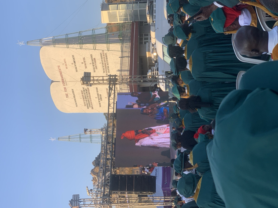 A large crowd dressed in green robes and gold caps gathers outdoors. Behind them, a giant monument shaped like the Ten Commandments towers above the crowd, with the commandments written on it. A large screen displays a man wearing a red turban. Stage equipment and speakers are visible, suggesting a public event or ceremony.
