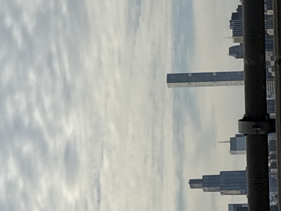 A low-angle shot captures a cityscape on a cloudy day. Tall buildings rise against the sky, including a prominent rectangular skyscraper. A blurred metal structure, possibly a pipe or pole, dominates the right side of the frame. The sky is filled with varied cloud formations. The overall perspective gives a sense of looking up at the urban landscape.