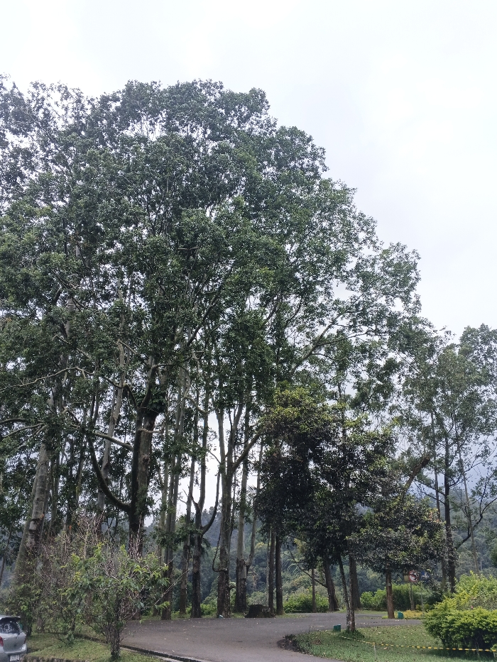 Tall, thin trees with dense green foliage dominate the frame against a cloudy sky