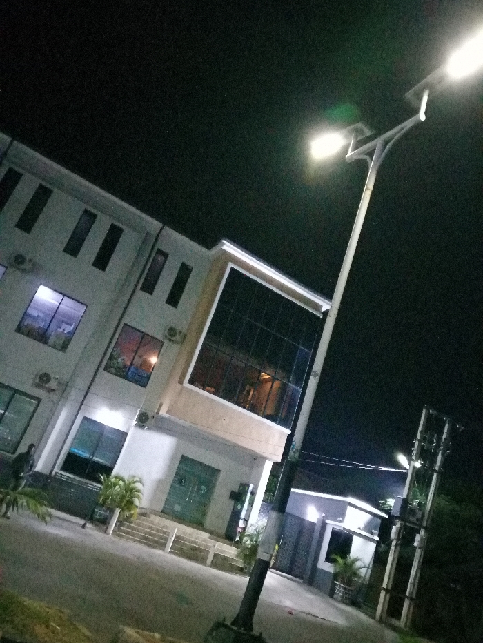A low-angle shot depicts a modern building at night, illuminated by a streetlight. The building features multiple windows, some with visible interior lighting and decorations. A large, glass-fronted section adds a contemporary touch. The entrance includes steps leading to a double-door entrance. To the right, a smaller building is visible, also illuminated. Power lines and a utility pole are positioned nearby, adding to the urban landscape. The overall scene is well-lit, contrasting with the dark night sky.