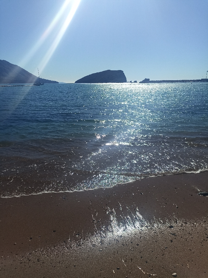 The image captures a sunlit coastal landscape in Budva, Montenegro, likely viewed from a beach within Budva Bay, facing towards Sveti Nikola Island