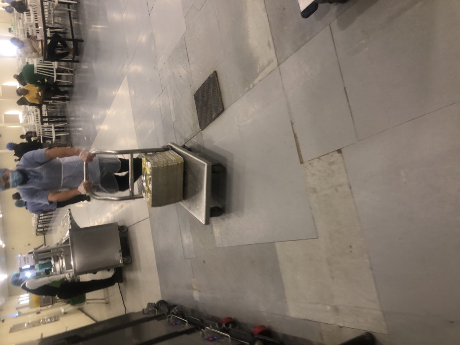 An indoor scene in a large cafeteria or dining hall in النعيلة, Saudi Arabia, is depicted. A person, wearing a light blue scrub top, a white apron, a light blue surgical mask, and gloves, pushes a silver metal utility cart toward the viewer. The cart carries a stack of numerous rectangular, gold-colored food containers or trays. To the left, another individual in a dark vest over a light green shirt and dark trousers stands beside stainless steel mobile serving units. In the background, multiple individuals are seated at white tables with white chairs, some consuming food from similar gold-colored containers, while others observe or converse. The floor consists of large, light grey square tiles, with visible wear, discoloration, and some lighter-toned patches. A dark, rectangular, textured mat lies on the floor to the right of the central cart. The overall environment is well-lit and appears to be a functional service area.