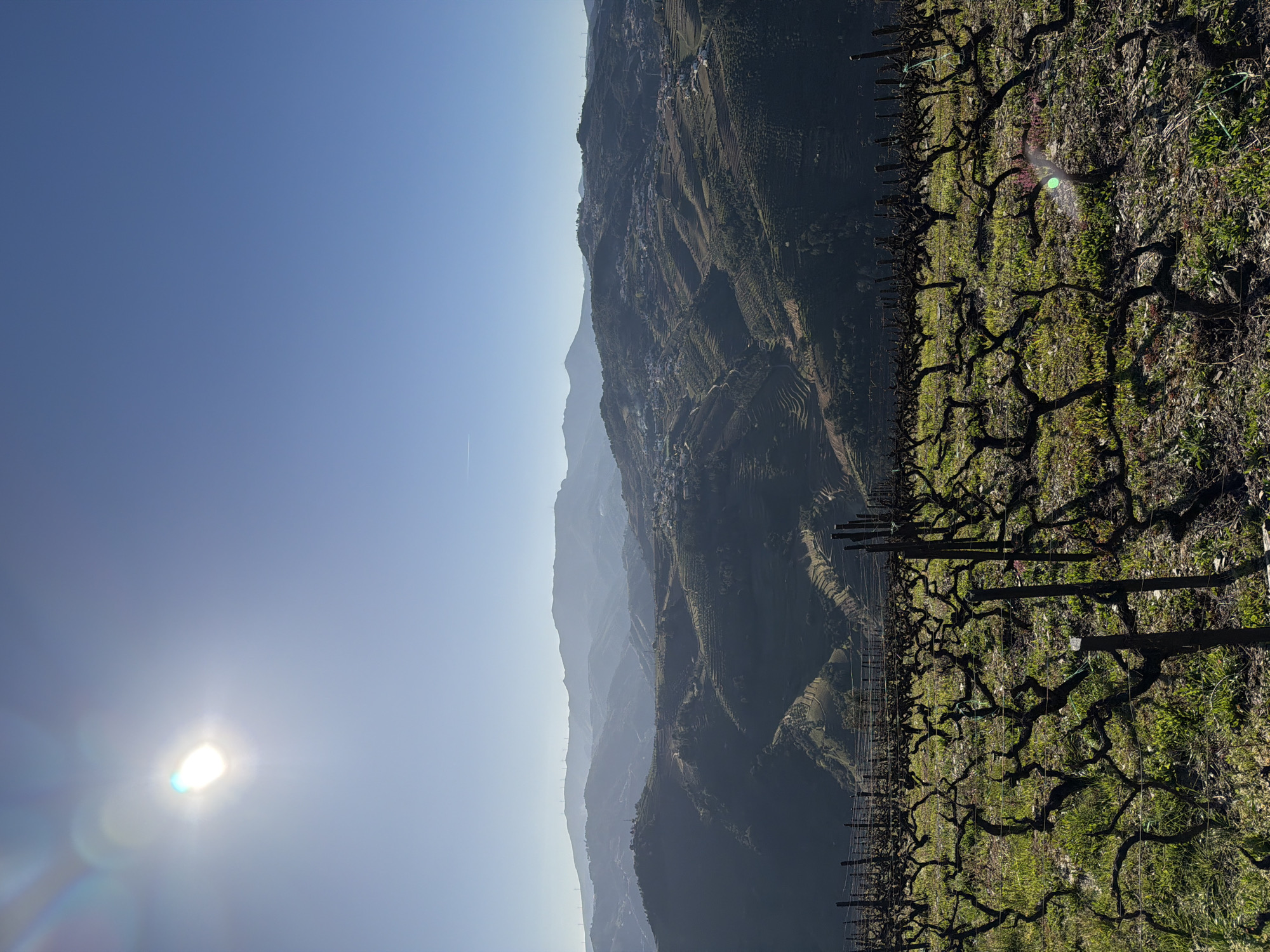 - "The image depicts a vineyard in Vila Real, Portugal, set against a backdrop of layered mountains under a clear blue sky with the sun visible" by FM-XZbV72, licensed under CC BY 4.0