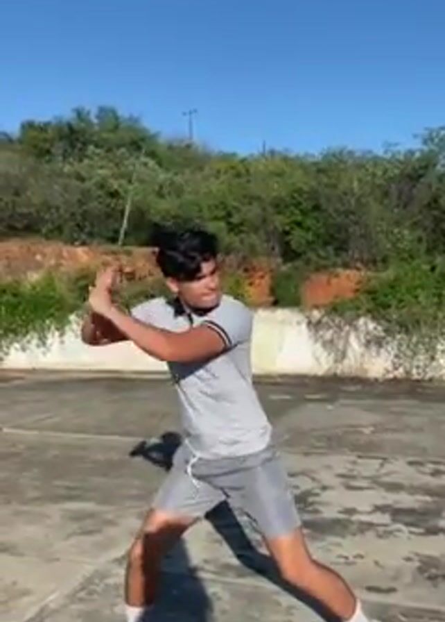 young man in a gray polo shirt and gray shorts, wearing white sneakers, swinging a long, thin, brown branch. He’s on a cracked, light-gray, paved area, possibly an old tennis or basketball court. Behind him is a low concrete wall covered in overgrown green bushes and trees. The sky is a clear, bright blue. The man swings the branch forcefully around his body and then throws it up into the air. The camera follows the branch upwards.