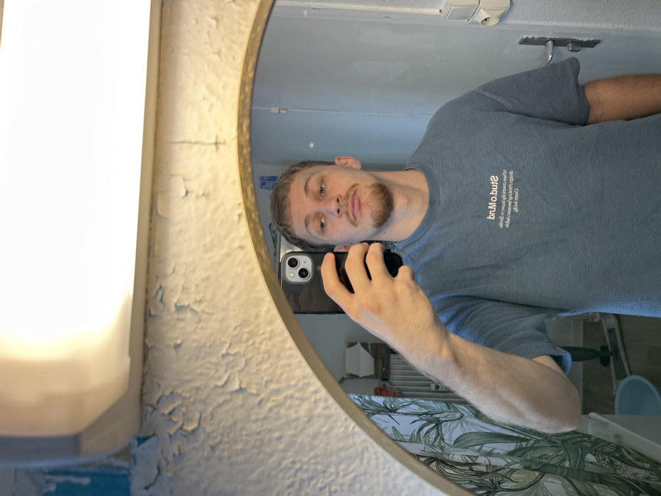 A young adult male is depicted in a mirror selfie within an interior setting