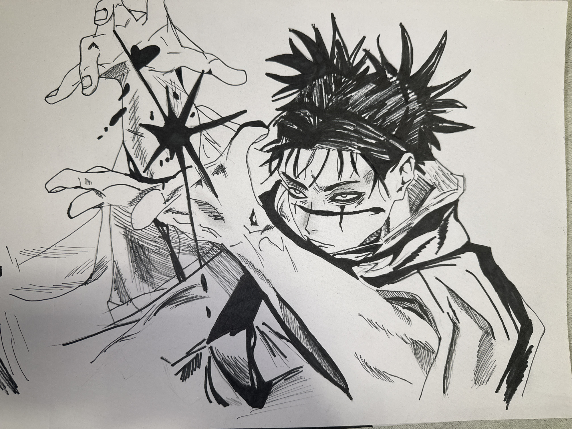 The image is a black and white drawing of a man with spiky hair and dark markings under his eyes. He is wearing what appears to be a hooded robe or jacket. He is depicted with his hands outstretched, and there are dark splatters or markings around his hands and on his arms. A large, star-like shape is prominent between his hands. The style is reminiscent of manga or comic book art. There are no elements suggesting the location is Berkovitsa, Bulgaria.