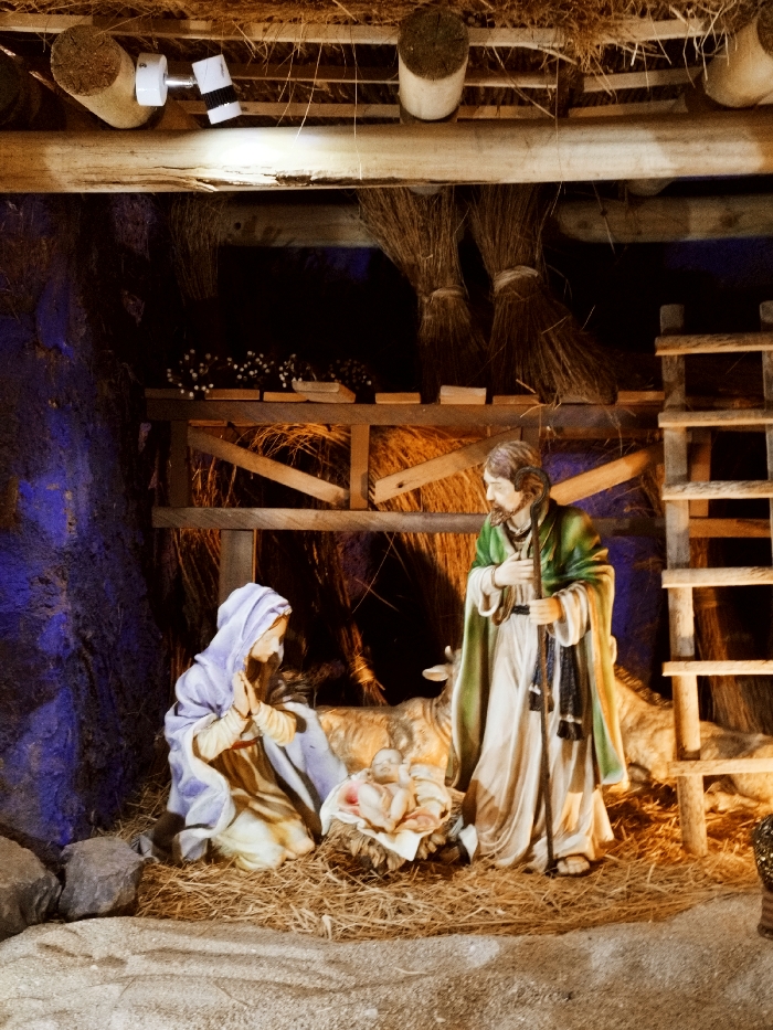 A Nativity scene depicts the Holy Family