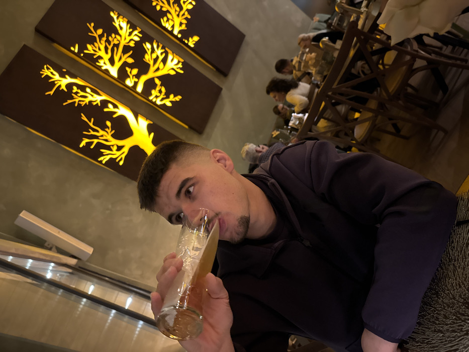 - "An indoor scene in a restaurant or bar in Căciulați, Romania, features a young adult male in the foreground, actively drinking from a clear glass filled with a light amber liquid" by FM-uEVzD3, licensed under CC BY 4.0