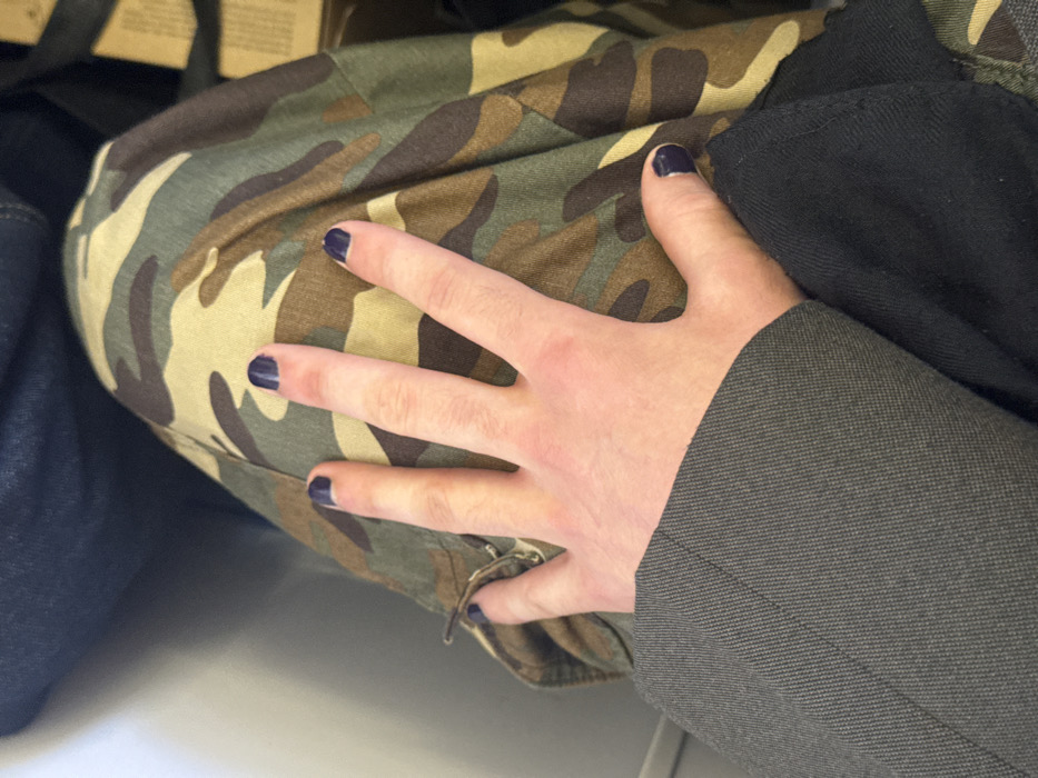 A downward-angled shot captures a human left hand resting on a camouflage-patterned leg. The hand has fair skin and displays dark purple nail polish on all visible fingernails, with slight redness on the knuckles. The lower left forearm is covered by a dark grey, textured fabric sleeve. The camouflage trousers exhibit green, brown, tan, and black patterns, with a metallic clasp visible on their upper-left side. A dark blue fabric is partially visible in the upper-left background, while a textured brown object occupies the upper-right background. A light grey surface borders the far left. This interior scene is located in Antony, France.
