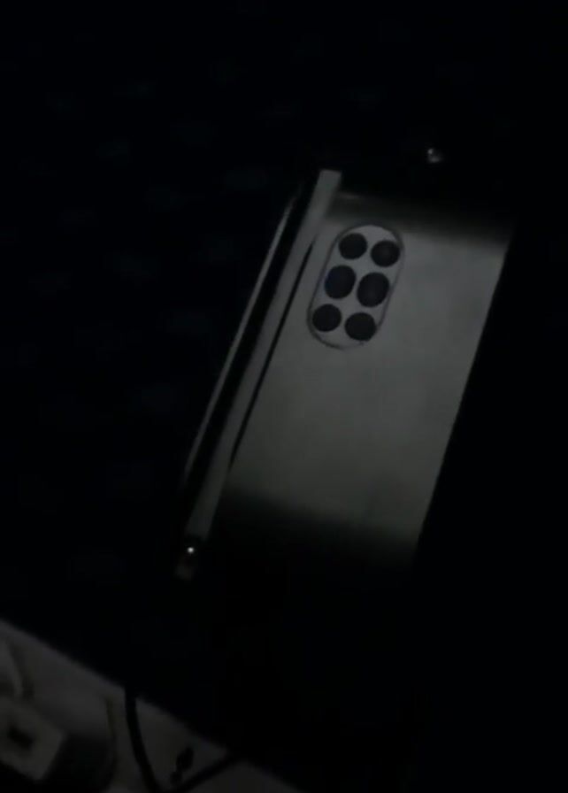 A dark video shows a smartphone with a metal casing lying on a dark surface. The camera module on the back has six lenses arranged in a 2x3 grid. A power strip with several plugs is visible in the bottom left corner of the frame. Music is audible.