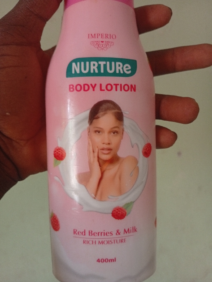 A dark-skinned hand holds a light pink plastic bottle of 'IMPERIO Nurture Body Lotion'. The bottle's label features a fair-skinned woman with dark hair, one hand near her face, framed by white, milk-like swirls and red berries. Visible text on the bottle includes "NURTURE BODY LOTION", "Red Berries & Milk", "RICH MOISTURE", and "400ml". The background is an unadorned, light beige wall. The scene is located in Unknown, Unknown.
