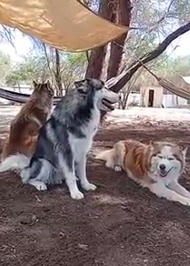 Three dogs rest in a dirt area with a beige canopy overhead and hammocks in the background