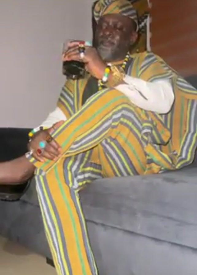 An older man is seated on a gray couch, legs crossed, dressed in a yellow, gray, and green striped suit and matching hat. He wears multiple bracelets, rings, and a necklace. He takes a sip from a glass held in his right hand, his eyes closed. A song is playing in the background. He appears relaxed and content. The environment is a simple room with white walls.