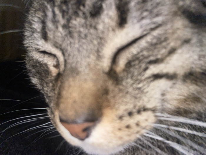 - "A close-up of a tabby cat's face, seemingly sleeping or resting" by FM-qaxKg1, licensed under CC BY 4.0