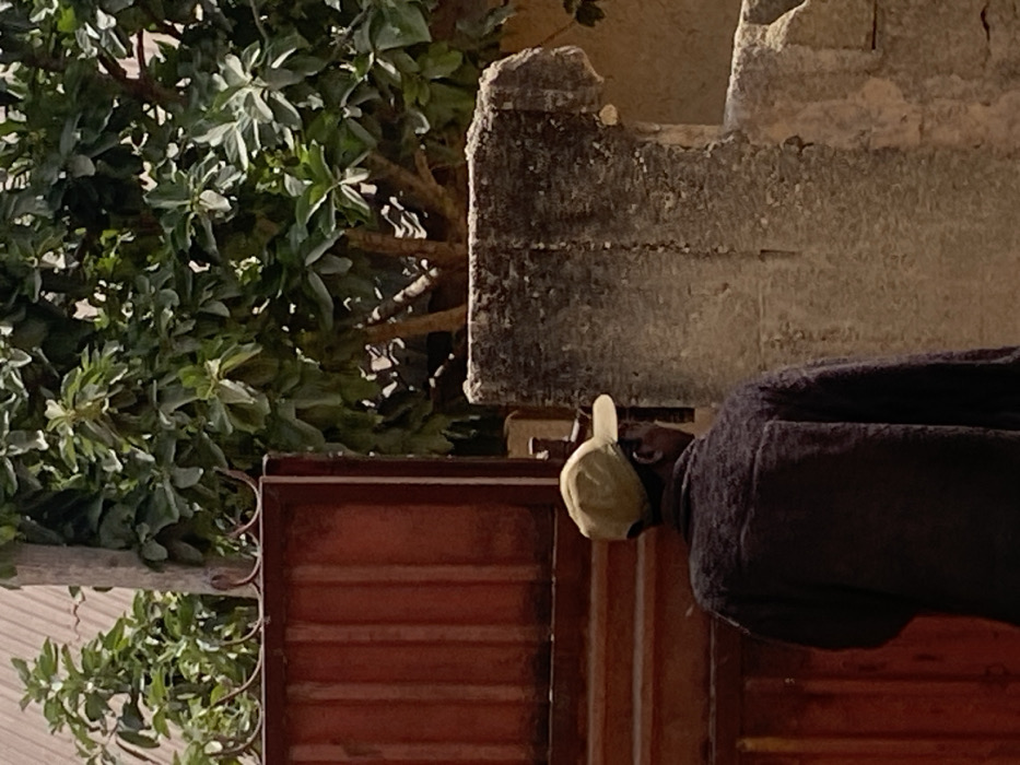 An individual is depicted from behind, positioned outdoors in Barakin Akawo, Nigeria. The person wears a light yellow or beige baseball cap and a dark, possibly purple-hued, textured long-sleeved garment. They are oriented towards the right side of the frame. To the left of the individual is a partially open, reddish-brown metal gate featuring vertical panels and curved ornamental spikes along its top edge. The gate exhibits signs of weathering and discoloration. To the right of the individual and behind the gate is a weathered, discolored concrete or stone pillar with an irregular, worn top section. Dense green foliage, consisting of trees or bushes, occupies the background, visible above and behind the gate and the pillar. The scene is illuminated by natural light, indicating daytime.