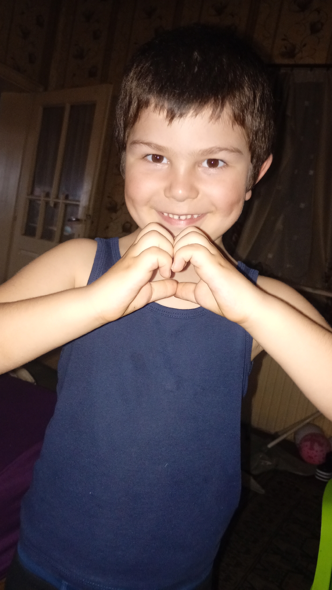 A young child with dark hair and brown eyes, wearing a navy blue tank top, smiles and makes a heart shape with their hands in front of their chest. The background includes a partially visible door and curtain. The location is in Alfatar, Bulgaria.
