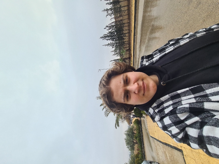 A person with short, curly brown hair is wearing a black hoodie under a white and black checkered shirt
