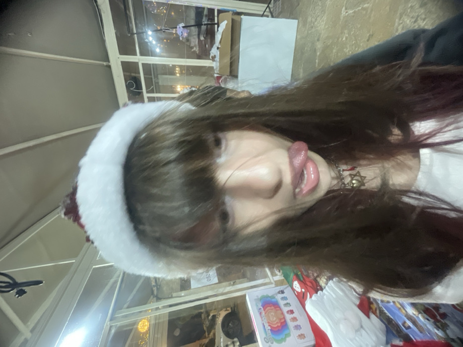 A young individual, appearing female, is depicted in a close-up, forward-facing shot, wearing a red and white Santa hat. Long, dark brown hair with bangs covers their forehead, obscuring the upper portion of the eyes. The individual is making a playful expression, extending their tongue outwards. A dark choker necklace with a gold-colored Star of David pendant and a small red charm is visible around the neck, above a white garment. The background reveals an enclosed or semi-enclosed structure, possibly a covered patio or a temporary market stall, characterized by white-framed glass panels and a white ceiling with visible support beams. To the left, through the glass, an exterior night scene includes a parked white car, distant ambient string lights, and a white sign displaying a partially visible "052" phone number prefix. Below this, a display surface holds a white box labeled "Summer" with colorful graphics, stacked white fabric items, and a red fabric object featuring a Santa face. To the right, through the glass, an interior space is illuminated by string lights and contains a brown cardboard box and a white surface or table. The floor is a light-colored, possibly paved, material. The presence of the Santa hat, Christmas-themed fabric, and the Israeli phone number prefix "052" indicates the scene is set during the holiday season in Israel, specifically in the city of Haifa, as directed.