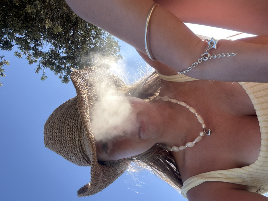 A low-angle shot depicts a woman with a straw hat exhaling vapor. She wears a light yellow top and a pearl necklace with a silver pendant. A silver bangle and a star charm bracelet adorn her arm. The background features a clear blue sky and a tree canopy partially obscuring the sun, creating a hazy effect around the vapor.