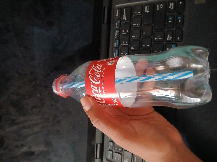 - "A light-skinned hand holds an empty, clear 350ml Coca-Cola plastic bottle containing a blue and white striped straw" by FM-oswMF3, licensed under CC BY 4.0