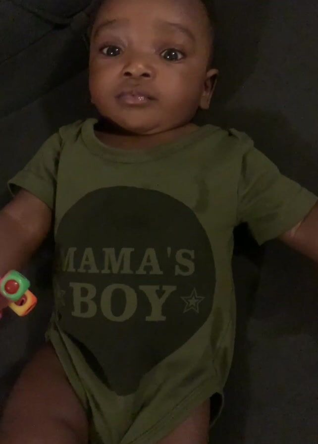 A baby lies on a gray surface, possibly a couch. The baby wears an olive-green onesie with a large black circle on the front. Inside the circle is the phrase "MAMA'S BOY" in a lighter shade of green, with a star included. The baby holds a small, colorful toy in their hands. The baby looks directly at the camera with a slightly serious expression. The environment is simple and domestic.