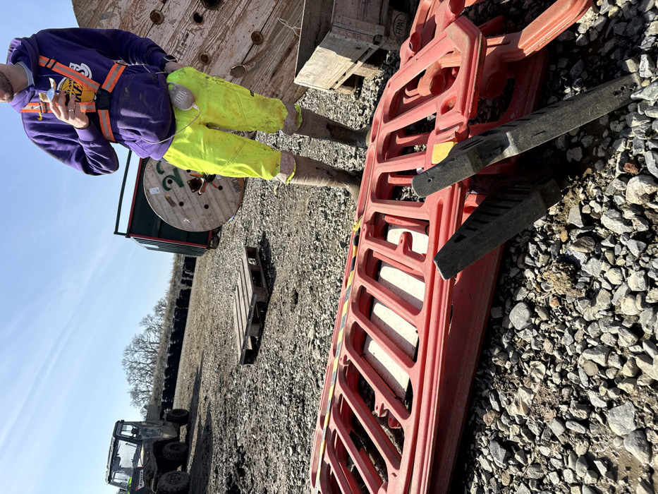 The image depicts an outdoor industrial or construction site on a clear day in Baldurgan Hill, Ireland. The ground consists of coarse gravel and dirt. In the foreground, two red plastic temporary barriers are stacked horizontally, with sections of yellow and black hazard tape visible on the top barrier. Two dark grey plastic barrier feet are angled against them in the lower right. A person is centrally positioned, visible from the chest down, wearing a purple hooded sweatshirt with a yellow Lakers logo, an orange high-visibility harness, bright neon yellow work pants, and dark brown muddy work boots. The individual holds a clear bottle with an orange label in their right hand. A grey JBL portable speaker is clipped to the person's right hip, connected by a white wire. In the midground to background, a green utility terrain vehicle (UTV) is parked on the far left. To its right, two wooden pallets are stacked. Further right and in the background, multiple large wooden cable reels are present, with one clearly marked "222 CABLE." A green industrial container or trailer is partially visible behind one of the cable reels. A line of black stacked tires forms a distant barrier. A small wooden crate or pallet box is situated to the right of the person's feet.
