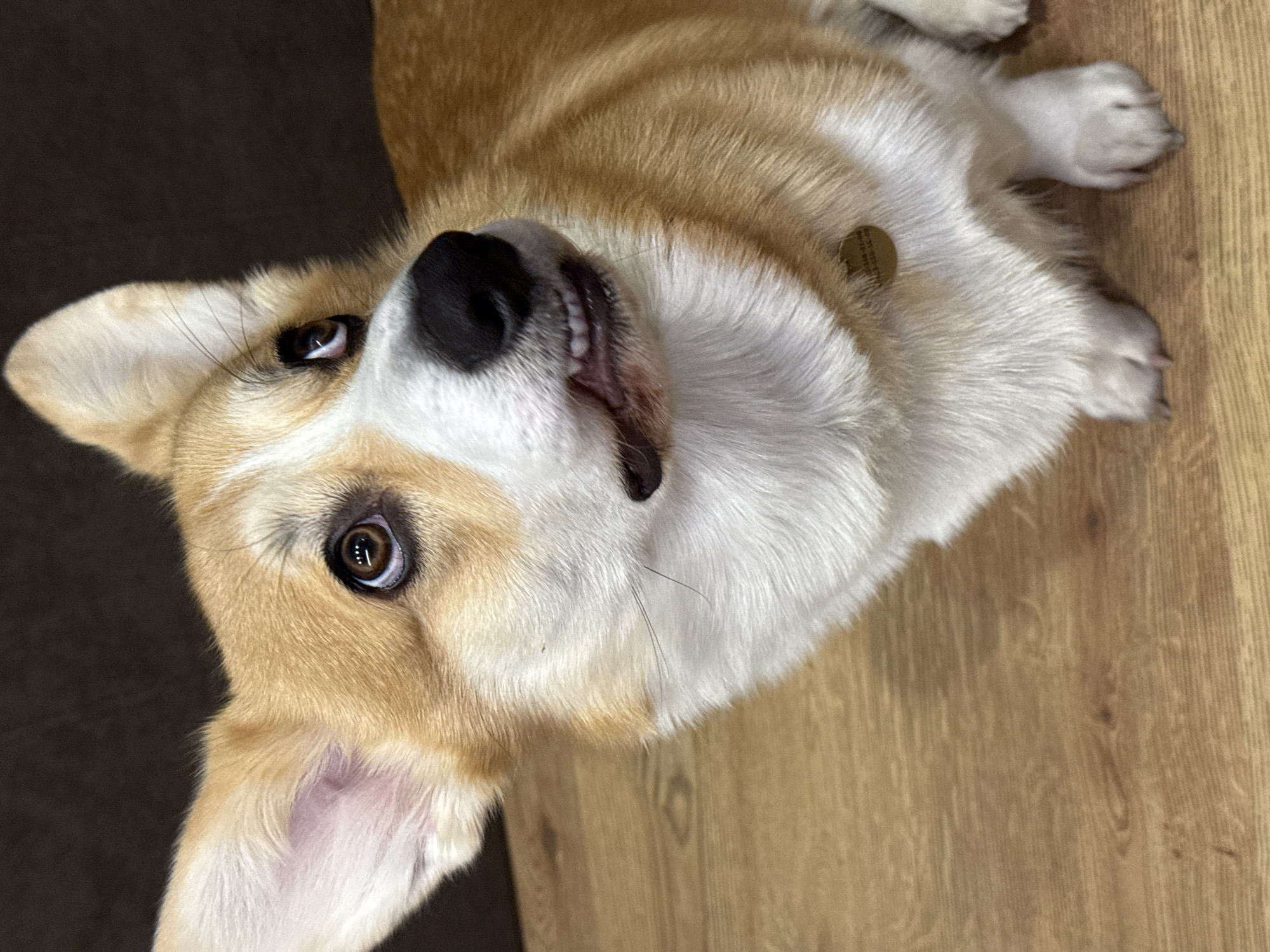 A Pembroke Welsh Corgi, exhibiting fawn and white markings, is depicted indoors in Krasnoyarsk, Russia. The dog is positioned on a light brown wooden floor, with a dark brown, out-of-focus background suggesting upholstered furniture. The dog is seen from a slightly elevated, frontal-left perspective, looking upwards and to its right with dark brown eyes. Its mouth is slightly agape, revealing a partial view of its white teeth. A small, circular, gold-colored identification tag is visible on its lower neck/chest, bearing indistinct dark alphanumeric inscriptions. The animal's front paws are visible on the wooden surface.