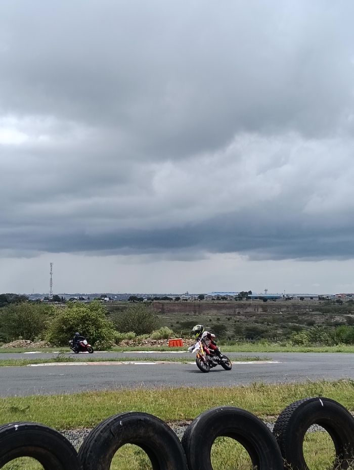 The image displays an outdoor motorcycle race track situated in Matathani ward, Kenya, under a uniformly overcast sky