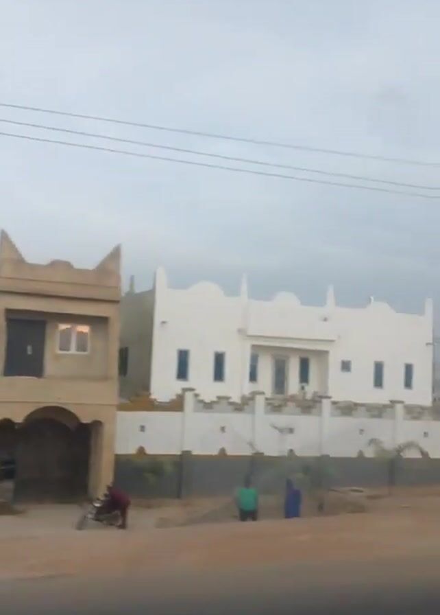 panning shot of a neighborhood on an overcast day. The camera appears to be inside a moving vehicle. The focus is on buildings along the roadside, primarily residential structures with fences, with some appearing newly constructed. A few individuals are visible outside, including pedestrians and a motorcyclist. The background reveals a wider cityscape, blending into the hazy horizon. Electrical wires stretch across the sky. The ground is dry and dusty.