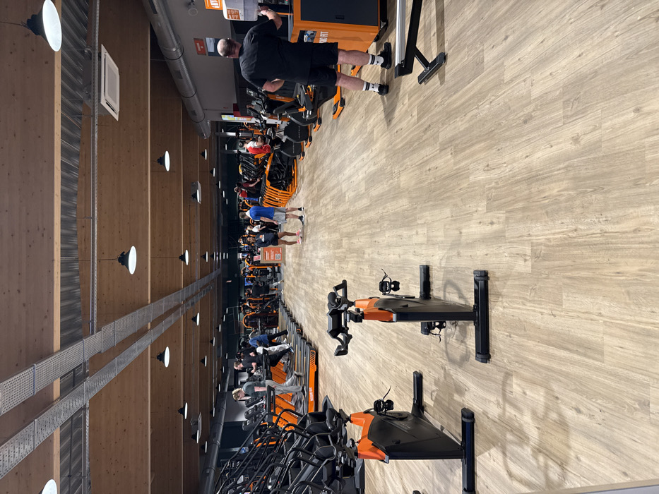 - "Inside a well-lit gym with a high ceiling and light wood paneling, rows of stationary bikes are arranged" by FM-sHh6Q2, licensed under CC BY 4.0