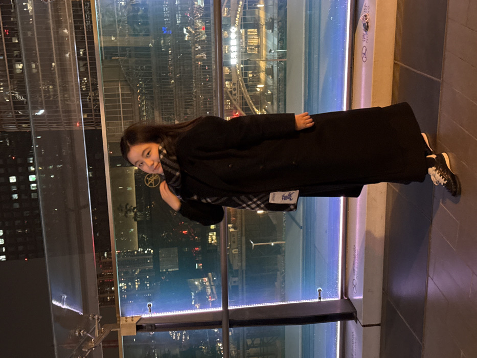 A single individual is standing at night on a dark paved surface in Chaoyang District, China. The person is positioned slightly left of center, facing the camera with a faint smile, wearing a long black coat, a grey and black plaid scarf with a white tag, and black sneakers with white laces. The individual's right hand is raised, lightly touching the scarf near the neck. Behind and to the left of the person is a clear glass barrier supported by metallic fixtures, incorporating vertical blue LED lighting. A horizontal metallic railing spans the lower portion of the barrier. Below the glass barrier, a white structure displays faint Chinese characters and a "no smoking" symbol. The background reveals a modern urban skyline illuminated at night, featuring multiple high-rise buildings and their reflections in a body of water or a highly reflective surface.