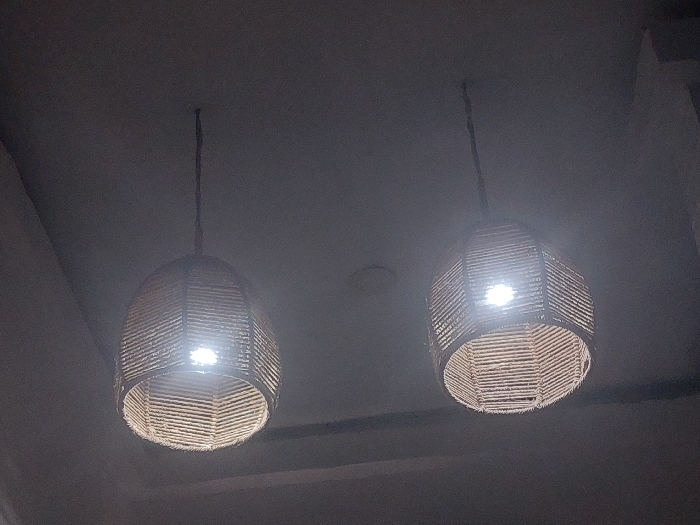 The scene depicts two illuminated pendant lights suspended from a dark, flat ceiling within an interior space. Each light features a bell-shaped shade constructed from a light-colored woven material, exhibiting both horizontal and vertical ribbed patterns. A distinct bright, white light source is visible within each shade, creating a central glare. The pendants hang by dark cords, with the right light positioned slightly higher than the left. No individuals, specific actions, or additional environmental details are discernible within the frame. This interior space is located within the city of Abuja, Nigeria.