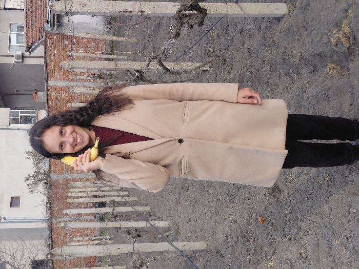 A female individual stands in a garden or vineyard setting in Nova Zagora, Bulgaria. She has long, dark, wavy hair and is smiling, looking directly at the camera. She wears a dark red top, a beige single-breasted coat with a dark button, and dark trousers. Her right hand holds a ripe yellow banana to her right ear, mimicking a telephone. Her left hand rests at her side. The ground beneath her is dark, bare earth. Behind her, rows of concrete posts with support wires hold dormant grapevines. A brick wall spans the mid-ground, separating the foreground from residential buildings in the background. These buildings are light-colored with windows, one featuring an external air conditioning unit. Bare trees and shrubs are also visible in the distance. The scene is illuminated by ambient daylight.