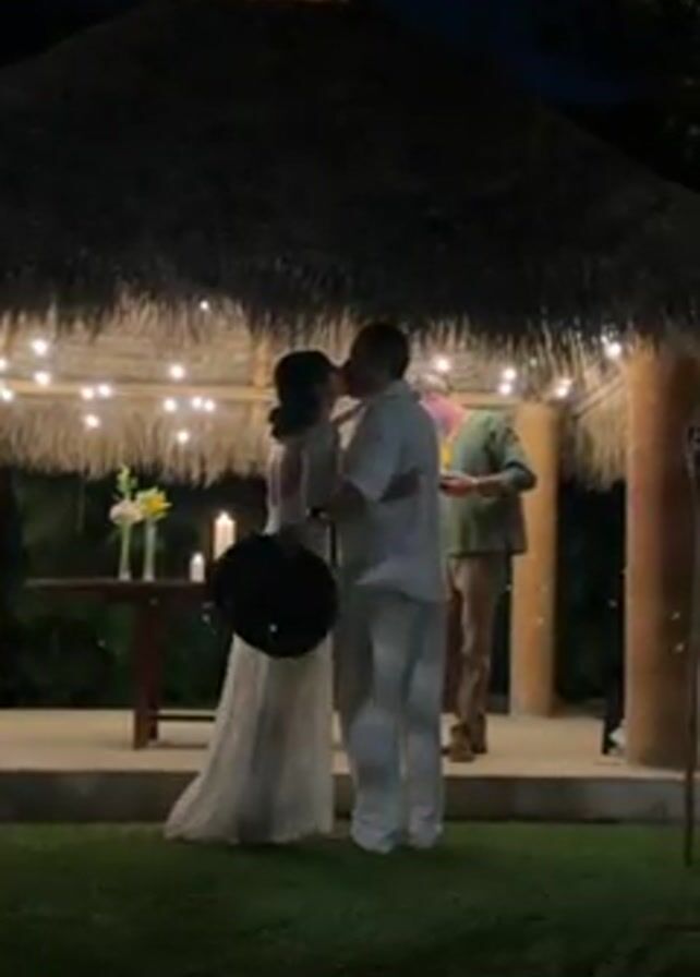 The video depicts a wedding ceremony taking place at night. Underneath a thatched-roof structure adorned with string lights, a bride and groom are embracing after seemingly exchanging vows. The bride wears a white dress, while the groom is dressed in white pants and a shirt, holding a black hat. A man in a green sweater and brown pants stands to the side, appearing to have officiated the ceremony. A small table decorated with flowers and candles sits in the background. The scene is set in a grassy area, and the overall atmosphere is celebratory.