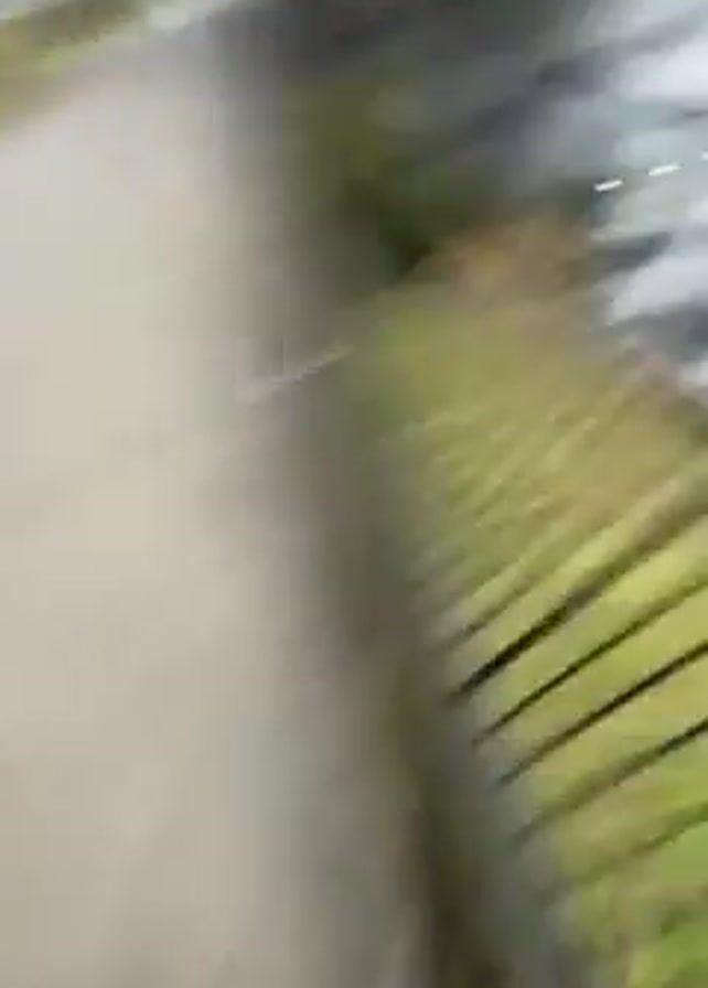 The video is shot from a first-person perspective, seemingly from a person walking a dog on a sidewalk